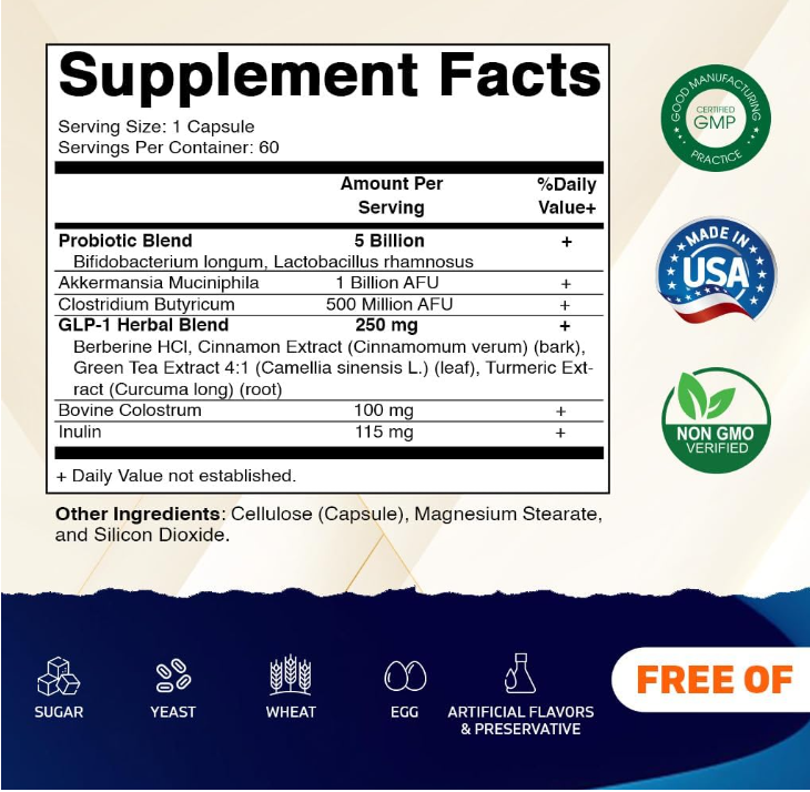 Vitamatic GLP-1 Support 60 Capsules GLP-1サポート サプリメント 60カプセル(2か月分) 3本セット このサプリは「腸内環境 × 血糖・脂質代謝 × GLP-1刺激」を狙った総合的なダイエットサポート処方です。 特に 話題のヤセ菌アッカーマンシア、ベルベリン、イヌリンがトリオで含まれている点が、最近の代謝研究でも注目されています。 さらに、シナモン、カテキン、ターメリックも配合