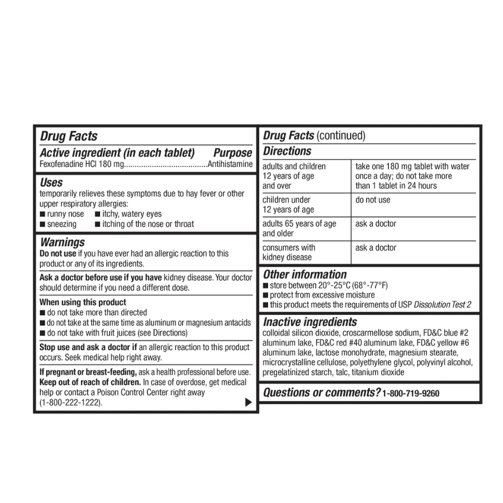 成分 有効成分(1 錠あたり) フェキソフェナジン塩酸塩180mg・・・抗ヒスタミン剤 ご使用上の注意をよく読んでからご使用ください。 (アメリカにおける注意書きとなります)