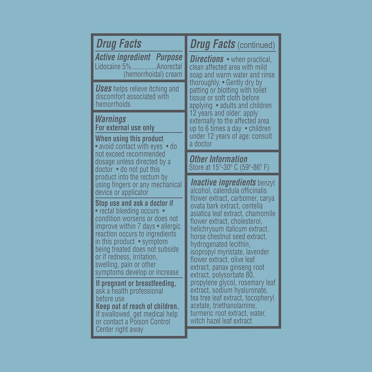 (成分) Lidocaine 5% ..... Anorectal (hemorrhoidal) cream benzyl alcohol, calendula officinalis flower extract, carbomer, carya ovata bark extract, centella asiatica leaf extract, chamomile flower extract, cholesterol, helichrysum italicum extract, horse chestnut seed extract, hydrogenated lecithin, isopropyl myristate, lavender flower extract, olive leaf extract, panax ginseng root extract, polysorbate 80, propylene glycol, rosemary leaf extract, sodium hyaluronate, tea tree leaf extract, tocopheryl acetate, triethanolamine, turmeric root extract, water, witch hazel leaf extract