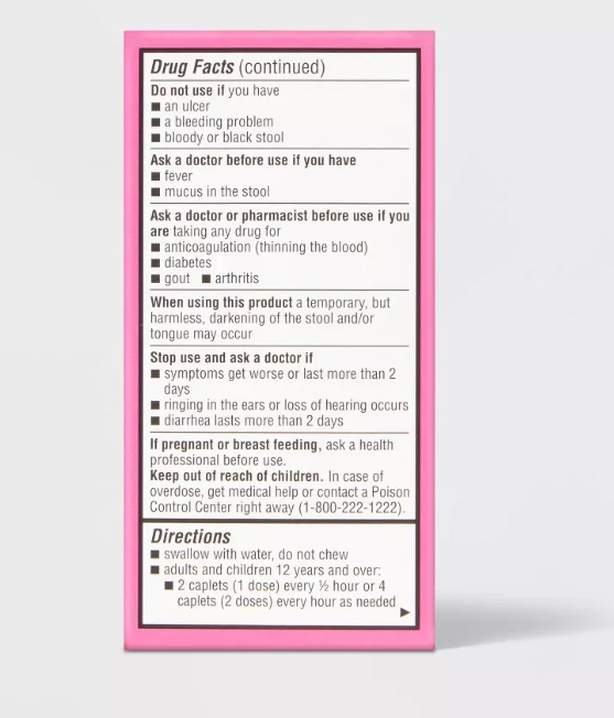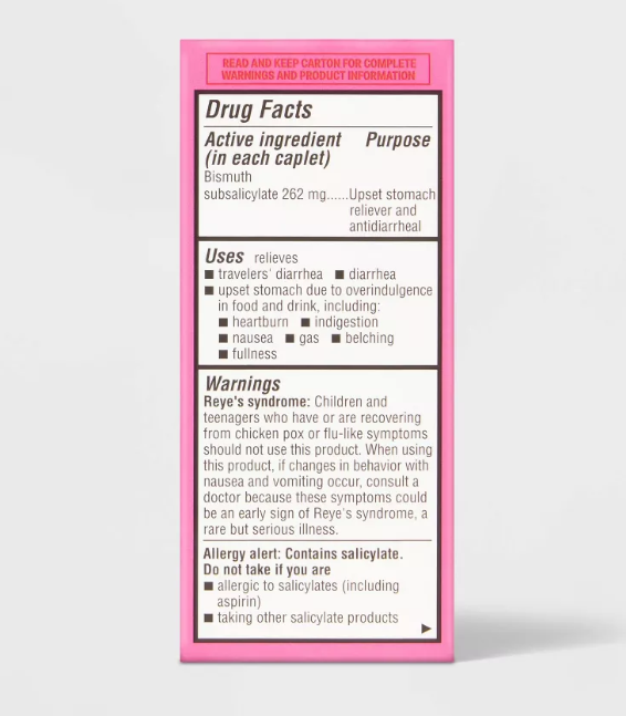 【有効成分】 Bismuth subsalicylate 262 mg(胃の不快感緩和・下痢止め)